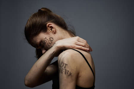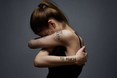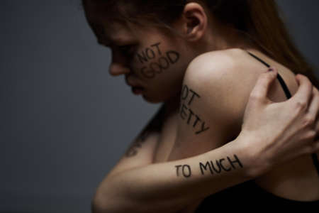woman with offensive inscriptions on her body touching herself with hands stress frustration hate