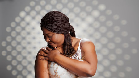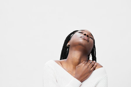 Young Black woman with braided hair expresses tranquility against a minimalist white background, wearing a cozy off shoulder sweater, highlighting serenity and calmness