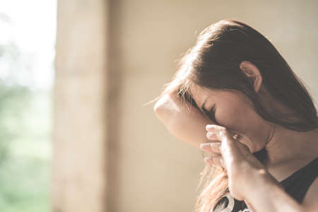 Portrait of young attractive caucasian woman suffering from depression, stress and anxiety. Sad and lonely woman crying, feeling depressed, distressed, worried and overwhelmed. Mental Health care.