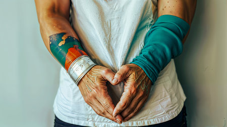 Tattooed hands of a tattooed woman in a white T-shirt