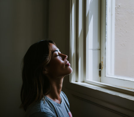 Woman Overcome with Sadness and Grief on a Dark Studio Background