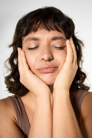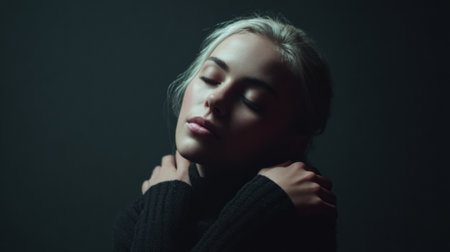 Young woman hugging herself with closed eyes and peaceful expression