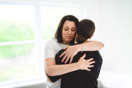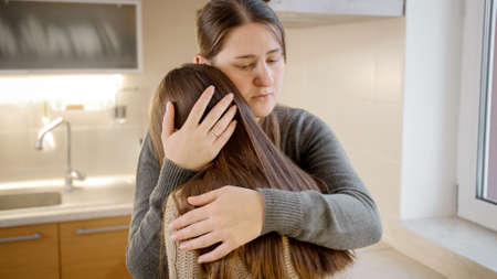 mother comforting depressed sad teen girl, hugging daughter with love