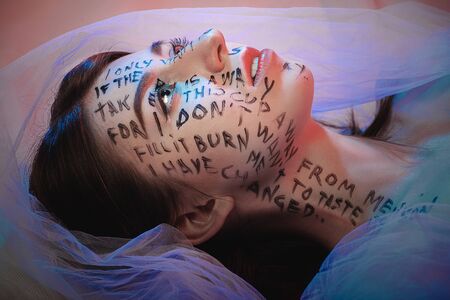 female creative makeup with letters on face. woman looking up, studio shot with blue lighting, profile view