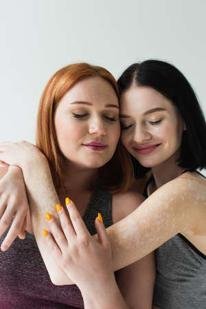 Sportswoman with vitiligo hugging plus size friend with closed eyes isolated on gray