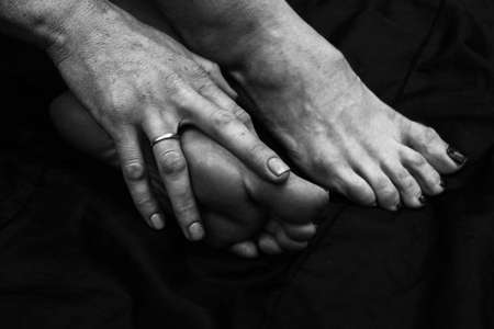 Female legs, hands. beautiful feet and palms on a black background, close-up. Black and white photography, natural light.