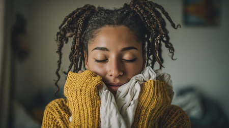 A young woman with braided hair in a mustard yellow knit sweater enjoys the scent of freshly washed laundry. Her relaxed expression captures a cozy, serene moment.