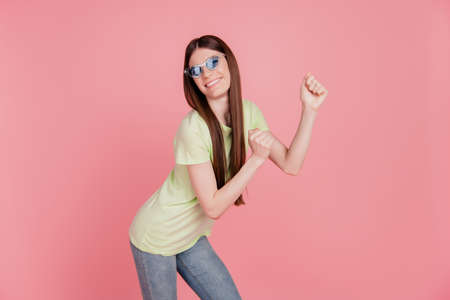 Portrait of her she nice-looking attractive cheerful pretty girl dancing having fun isolated over pink color background