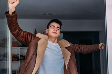 young man at home going out to the balcony stretching