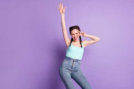 Photo of happy nice cheerful young woman stick out tongue make v-sign dance isolated on purple color background