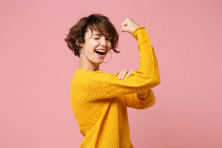Side view of funny young brunette woman girl in yellow sweater posing isolated on pink wall background. People sincere emotions lifestyle concept. Mock up copy space. Showing biceps, muscles blinking.