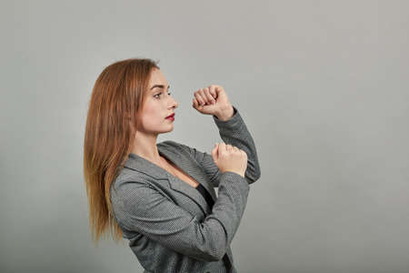 Arms up celebrating success fists in exultation. Young attractive woman, dressed gray jacket, with green eyes, light brown hair, background