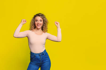 Curvy woman doing we can do it gesture on a yellow background
