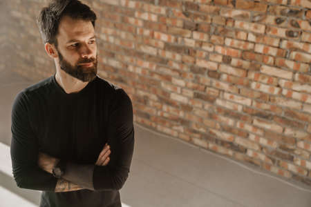 Young handsome man with a beard is smiling. Serious man folded his arms over his chest