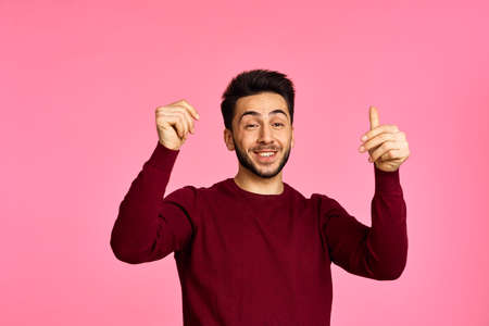 Cheerful bearded man in sweater posing pink background