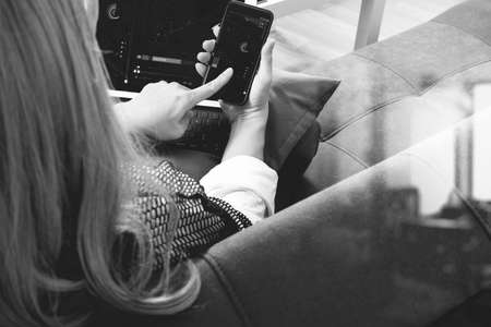 brunette woman using smart phone and digital tablet computer on sofa in living room,black and white