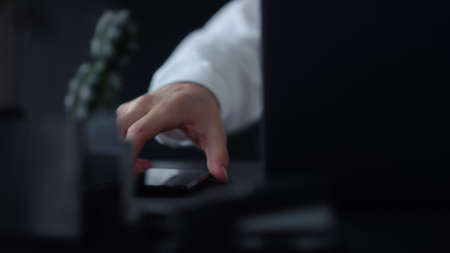Close-up view of businesswoman writing her schedule on smartphone in dark trendy workplace