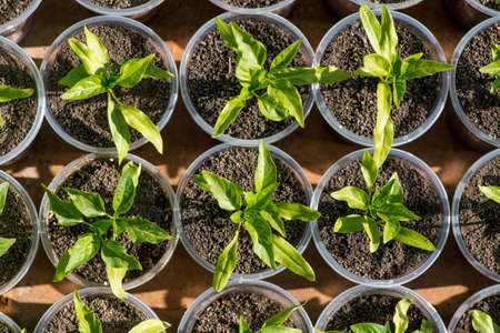 pepper seedlings growing in a greenhouse - selective focus, copy space