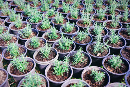 rosemary plant in pot in the natural herb farm nursery plant garden, little fresh rosemary herb is growing in a flower pot indoors