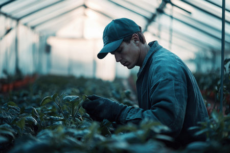 A young man in a blue cap inspects plants in a greenhouse, surrounded by lush greenery and soft morning light filtering through glass panels. Generative AI