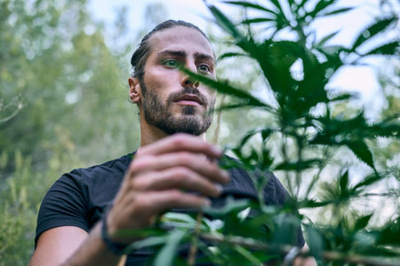 Young farmer checking cannabis plants in the fields before harvesting. Concept of herbal alternative medicine