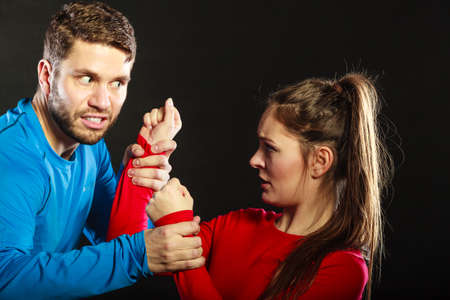 Husband fighting with wife. Aggresive man and woman in studio on black. Domestic violence aggression. Bad relationship.