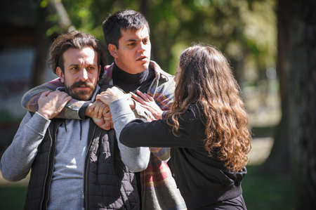Two aggressive, angry, nervous and upset men in a quarrel and a woman who trying to prevent a conflict. Group quarrel concept