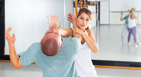 Girl using palm to launch blow in chin during self defence training