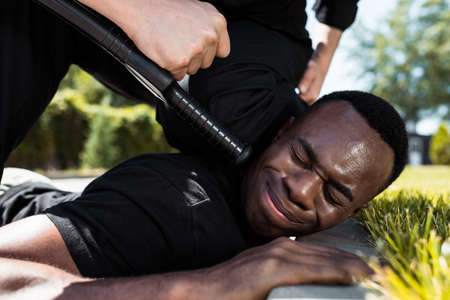 selective focus of detained african american man suffering from pain while lying near policeman with baton, racism concept