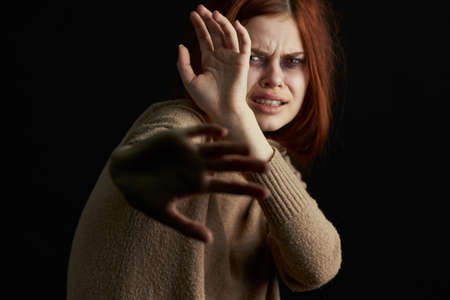 Battered woman protecting herself with hands screaming for help from the darkness.