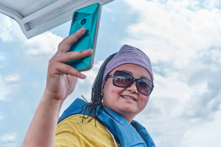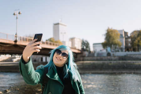Female traveler looking at her phone and making selfie. Woman with blue hair wearing sunglasses making selfie while standing side river, with copyspace. Perfect for magazines, brochures, flyers and posters.
