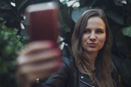 mobile photography and selfie trend. young stylish girl taking photoof herself using smartphone. social media bloggers lifestyle.