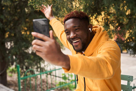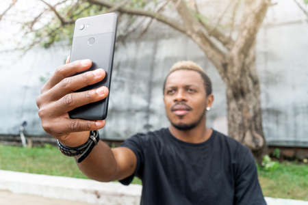 Close up of attractive dark-skinned man making selfie on mobile phone.