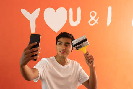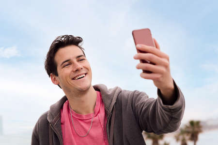 happy young man recording a video call with his smart phone, concept of technology and communication