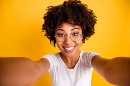 Close up photo beautiful amazing she her dark skin lady make take selfies cute attractive white teeth gorgeous smile wear specs casual white t-shirt isolated yellow bright vibrant vivid background