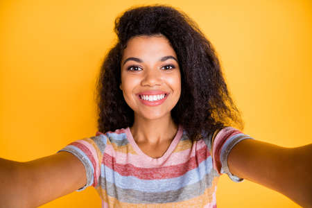 Self-portrait of her she nice attractive lovely cheerful cheery glad wavy-haired girl wearing striped t-shirt isolated on bright vivid shine vibrant yellow color background