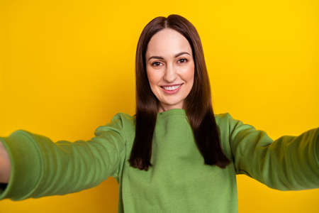 Self-portrait of attractive cheerful woman good mood rest isolated over bright yellow color background