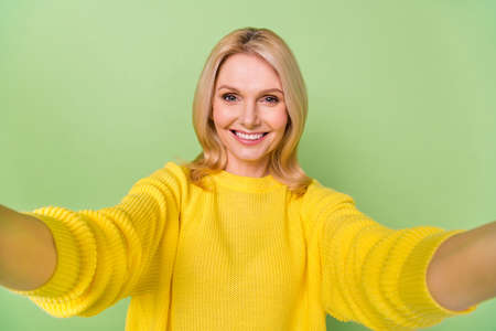 Photo of positive aged lady making selfie on autumn vacation wear knitwear pullover isolated green color background