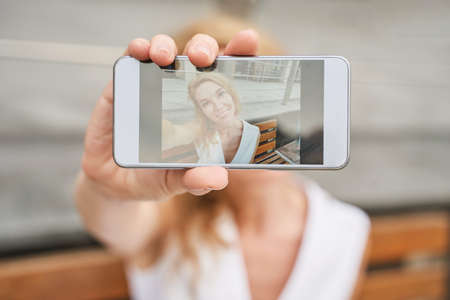 Young beautiful woman holding smart phone in outstretched hand. Phone displaying her portrait. Red haired female model.
