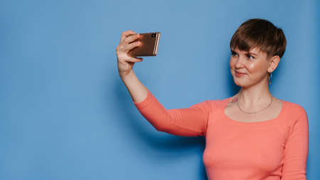 Portrait of a young woman taking a selfie on a smartphone on a blue background. A place for your text. The concept of video communication at a distance
