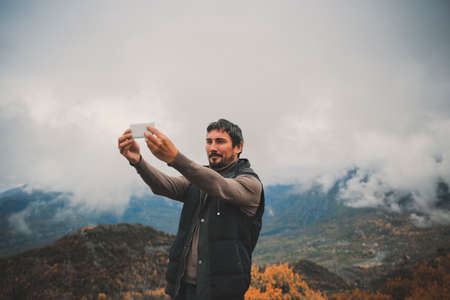 Trandy man take vacation selfie rainy autumn mountain landscape with cloudy sky on the smartphone. Travel concept