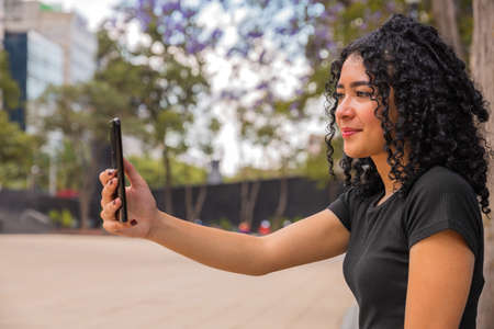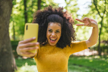 Young and beautiful afro american woman is happy smiling taking selfie via mobile phone. Woman posing in an outdoor park. Lifestyle concept of people.