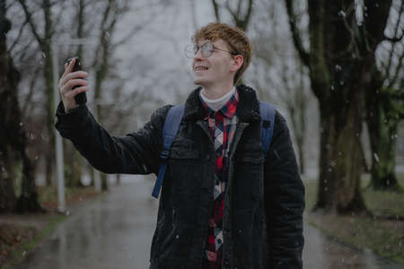 the guy smiles, takes a selfie on a mobile phone, it's snowing outside, curly hair on his head and round glasses for vision, the young man looks stylish and modern