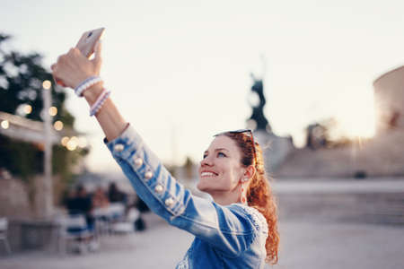 Young woman doing self portrait outside. City vacation portrait. Blogger selfie video. Travel local. Alone tourist. Happy emotion. Smiling female person. Lifestyle action. Posing