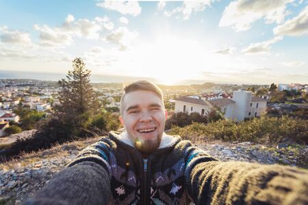 Caucasian young male taking selfie while camping in wilderness enjoying sunset