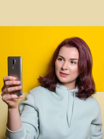 attractive young woman in a light green hoodie takes a selfie. Social media communication concept. Studio shot, skin retouching