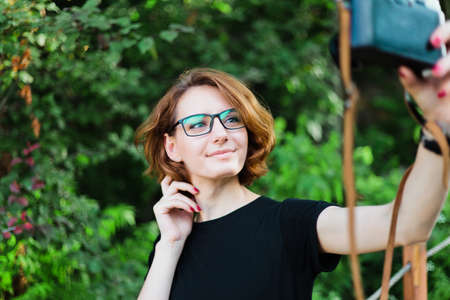 Young attractive female tourist takes selfie portrait on retro camera outdoors