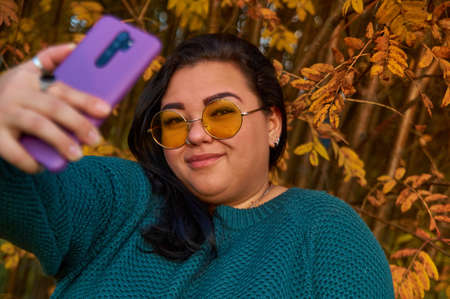 a girl takes a selfie against the background of autumn trees. self photo on mobile phone.