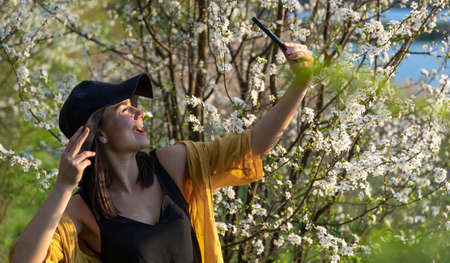 A stylish girl in a hat makes a selfie at sunset near flowering trees in the forest.