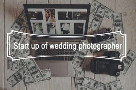 Start up for wedding photographing top view. A lot of dollars lying around laptop with wedding photos, digital and film cameras on white wooden background.